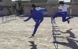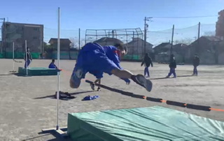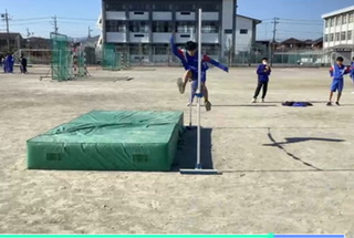 2年生の男子は、保健体育の授業で陸上競技(ハードル走・走り高跳び)を行なっています。ハードル走では、生徒同士で競い合いながら技能を高めています。走り高跳びでは、はさみ跳びとベリーロールの練習をしています。どちらの種目も、タブレット端末を使って自分の動きを撮って確認しながら練習しています。