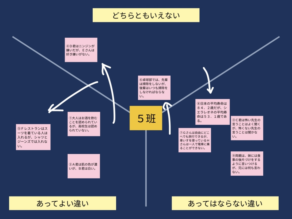 1時間目、3年3組では道徳の授業が行われていました。内容は「違い」についてでした。生活の中にある様々な違いを、班で話し合い、ロイロノートで「あってよい違い」「あってはならない違い」「どちらとも言えない違い」に分ける活動をしていました。その後、男女差別問題や障がいの有無による違い、国や地域による平均寿命の違いなどの解決に向けて自分自身ができることを考えました。「偏見や差別を減らしていきたい」や「困っている人に手を差しのべたい」などの意見がありました。