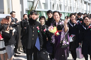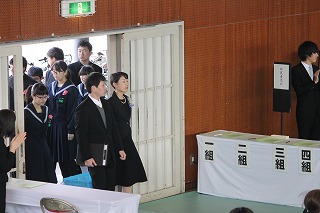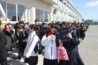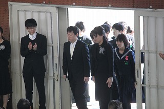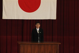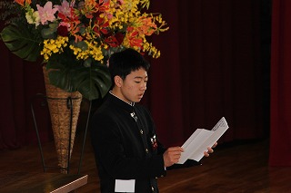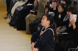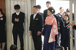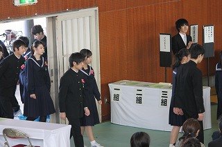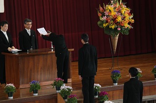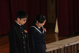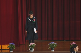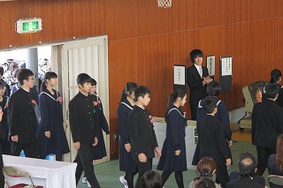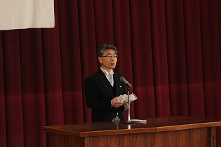 来賓祝辞の様子です。PTA会長から、生徒会長に記念品が手渡されました。