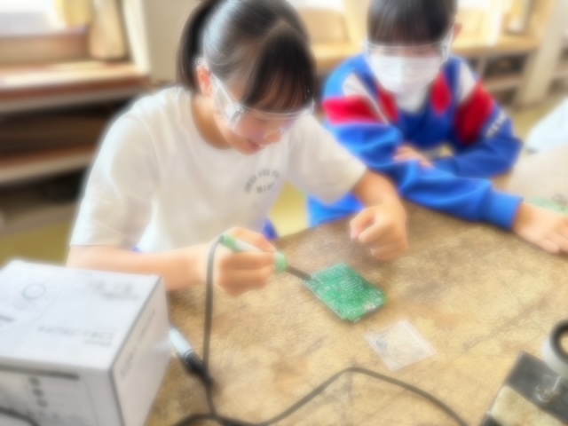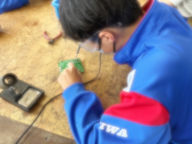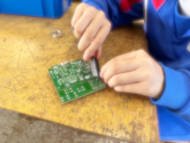 3年生の技術の授業でラジオ作りが始まりました。4月から学習している「エネルギー変換の技術」を考えながら、製作をしています。今日の授業では初めて「はんだづけ」を行いました。初めは緊張してプルプルと手を震わせながらはんだづけをしていました。授業の後半には慣れ、スムーズに活動することができていました。班の人と協力して取り組む姿も見られました。