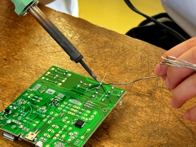 3年生の技術の授業ではラジオ作りをしています。製作初期は手を震わせながらはんだづけをしていましたが、練習をくり返し、現在はスムーズに作業を行うことができるようになりました。抵抗、ダイオード、コンデンサ、トランジスタなど、それぞれの電子部品の役割も学習しながら、今後も製作を続けていきます。