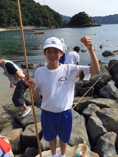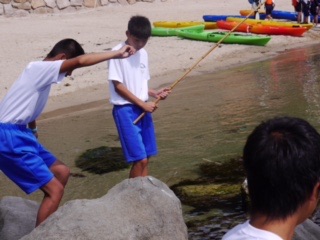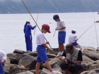 磯釣りの様子です。教務主任の原先生は、釣りが得意なので、今回講師を務めました。なかなか釣れないと聞いていましたが、講師が良いのか、たくさんの魚を釣りあげることができました!多い人は6匹も釣り上げたとか…