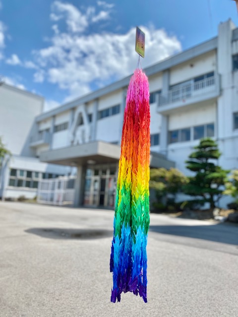 7月初旬に平和体験学習として、全校生徒で平和への祈りの思いを込めて千羽鶴を折りました。そして今日、生徒会執行部の生徒たちの手で完成させることができました。