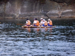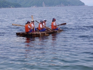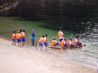 組み立て式いかだです。木材を組み合わせ、いかだを作ります。浮き、木材を運ぶところから作業は始まります。どの班もうまく作り上げ、班員を乗せてうまく浮いていました!