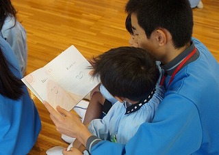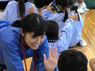 園児の歌を聴いたあと、「虹」を合唱し、園児とペアになって、自作絵本の読み聞かせなどの室内遊びをしました。その後、園庭へ移動し、外遊びをしました。