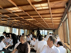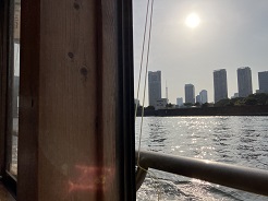 汽船に乗船し、もんじゃ焼きに舌鼓です。今日は天気がいいので、風が気持ちよさそうです。