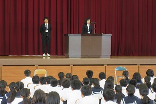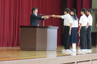 朝会で、地区陸上競技大会の表彰と西尾張大会の出場者の紹介を行いました。