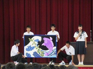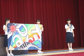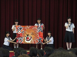 開会式では、校長先生の話、生徒会長の話、学校祭旗紹介、ブロック長の話、ブロック旗紹介を行いました。