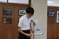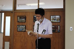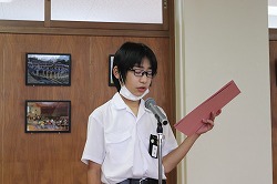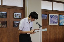 生徒会が取り回しを行い、校長先生のお話、新3年執行部のあいさつを行いました。続いて生徒会テーマの発表、学校祭テーマの募集を呼びかけました。最後に生活委員長が今週の目標を伝えました。