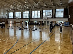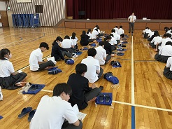 2年生が体育館で職場体験のしおりの読み合わせを行いました。また、実際に事業所に行ったときのあいさつのシュミレーションも行いました。生徒たちは照れながらも、真剣に練習に取り組んでいました。労働の基本は、まず気持ちのよい返事とあいさつが不可欠です。