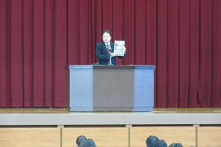 本日は、朝会で校長先生から40周年のお話を聞きクリアファイルを全校生徒に