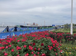 山下公園からの眺めです。世界トライアスロン選手権シリーズの準備中です。氷川丸とバラのコントラストが美しいです。
