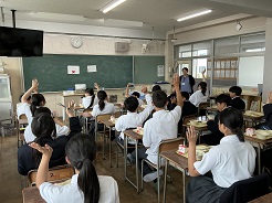 給食の時間に、スクールカウンセラーの先生が教室にあいさつに行きました。どんなことでも、気軽に話してくださいね。