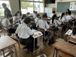 お手本は『研究成果』。生徒たちは集中して、熱心に書道に取り組んでいました。