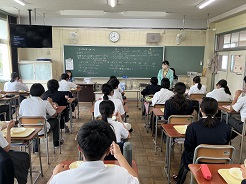 給食の時間に、スクールソーシャルワーカーの先生から自己紹介がありました。スクールカウンセラーとは少し仕事内容が違いますが、生徒の皆さんや保護者の皆さんの話を聞き、寄り添った支援をします。まずは、気軽に声をかけてくださいね。