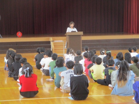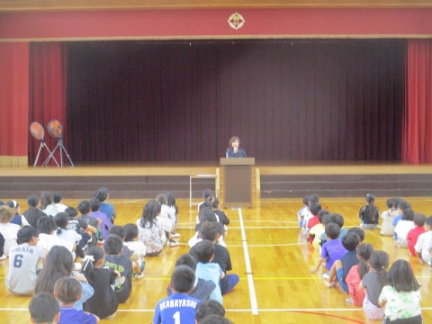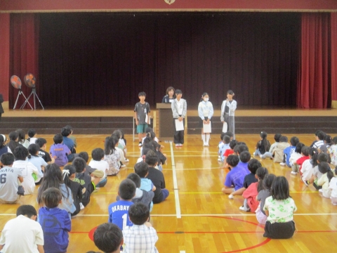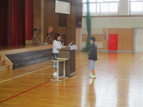 表彰後は、校長先生のお話を聞きました。その中で、始業式で確認した大切なこと 「あ…あいさつ い…いのち う…うたごえ え…えがお お…おもいやり」 が守れていたかの振り返りをしました。また、明日からの長い休みを、充実した日々にしてほしいため、目標を立てて、一日一日を大切に過ごしてほしいとお話されました。