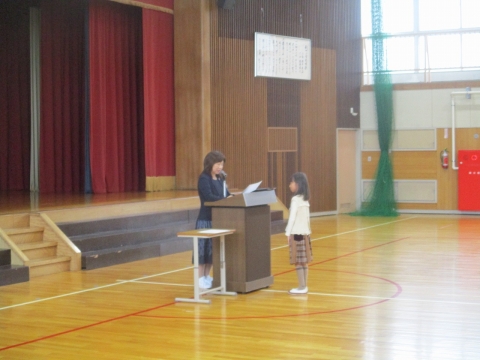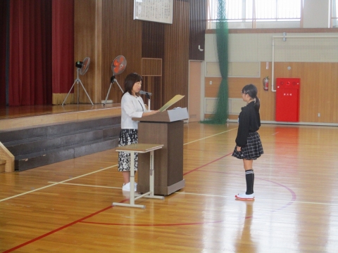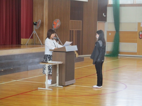最初に口腔保健賞と、卓球の大会で優秀な成績を修めた児童の表彰を行いました。