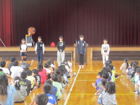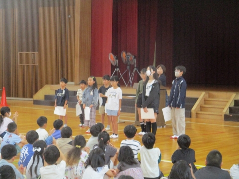 次に、6年の代表児童から、4月からの学校生活の思い出や感想の発表がありました。秋竹小の伝統でもあるなかま活動のよさを実感しているエピソードやなかま活動に対する思いを、また運動会の白熱したねずみの餅引きで学校全体が盛り上がり、とてもよい運動会であったとそれぞれ感想を述べました。