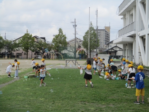 生活科で、シャボン玉遊びをしていました。自分で作った道具を使って、シャボン玉を楽しんでいました。