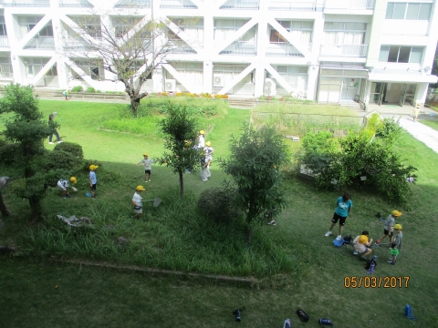 校庭で生き物探しをしていました。生き物を大切に扱っていました。