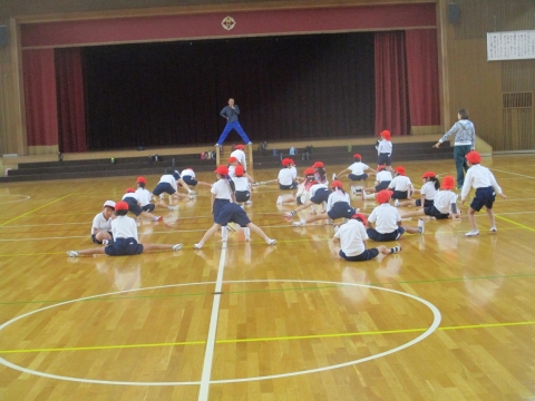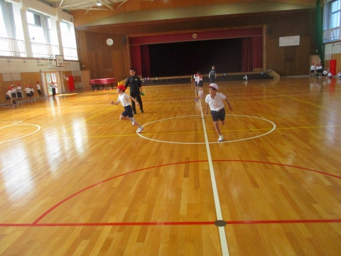 チーム対抗でフロアの線に沿って走る運動を行っていました。みんな楽しそうに取り組んでいました。