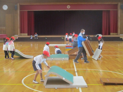 みんなで協力して、跳び箱を準備したり、片付けたりしています。