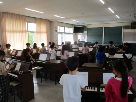 2つのパートでリコーダー演奏をしていました。音の重なりのよさを味わいながら取り組んでいました。