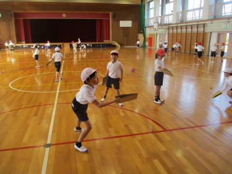 テニピンという球技に取り組んでいました。手に着けた用具で、ボールを操作する練習をしていました。