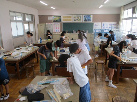 のこぎりの正しい使い方を学びました。ペアで協力しながら、木材を切っていました。