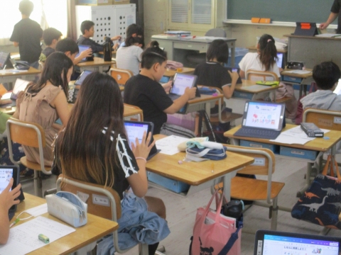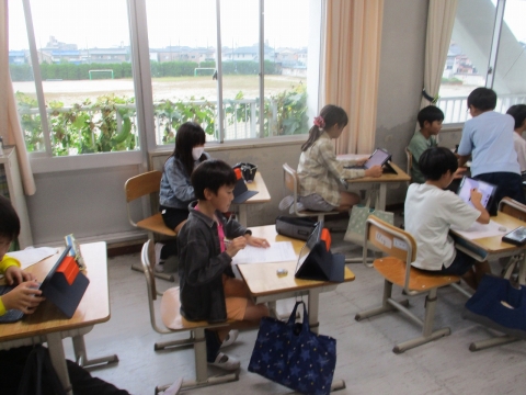 防災について、これまでの学習を振り返りながら、自分でテーマを設定し、調べたことや考えたことをタブレット端末を使ってまとめていました。