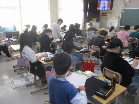 毛筆の練習を行っていました。お手本をみながら、一画一画慎重に書いていました。