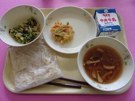 五目うどん(白玉うどん)、牛乳、かき揚げ、おかか和え、
