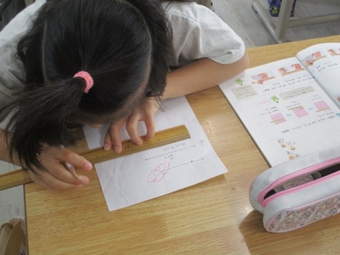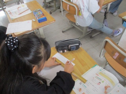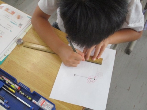 算数で、線の長さを定規で測ったり、与えられた長さを定規でかいたりする学習に取り組んでいました。センチメートルとミリメートルを正しく理解しながら、正確に長さを測ったり、かいたりしていました。先生から添削してもらい、丸をもらったときには、みんなうれしそうにしていました。