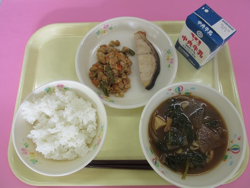 ご飯、牛乳、鮭の塩焼き、大豆の五目煮、豚汁