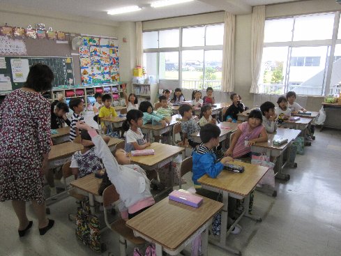 5月7日(月)今日から運動会練習が始まると言うことで、着替えに時間のかかる1・2年生は朝礼前に着替えました。朝礼の後、そのまま体育館で1・2年合同の朝の会を行いました。