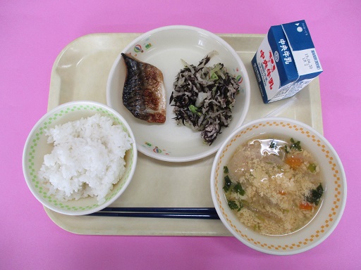 ご飯、牛乳、鯖のカレー焼き、ひじきサラダ、かき玉汁