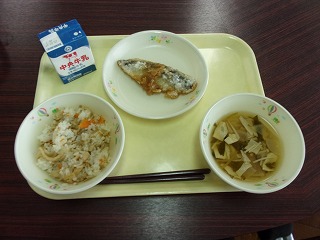 かきまわし(ごはん)、牛乳、アジのなんばんづけ、ゆばのすましじる