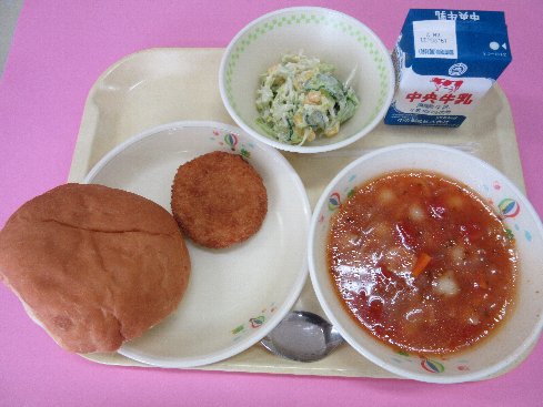 海老カツバーガー(サンドイッチバンズ)(海老カツ)(キャベツのサラダ)、牛乳、ミネストローネ