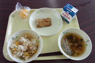 秋の実りご飯、牛乳、サンマのかば焼きエビとカブの吹き寄せ汁、柿