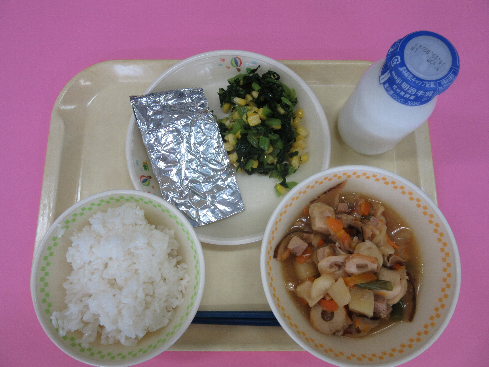 ご飯、牛乳、竹輪の磯辺揚げ、ほうれん草和え、のっぺい汁、乾燥小魚