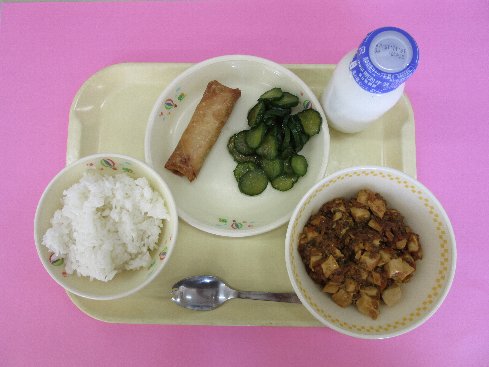 ご飯、牛乳、麻婆豆腐、春巻き、きゅうりの香り付け