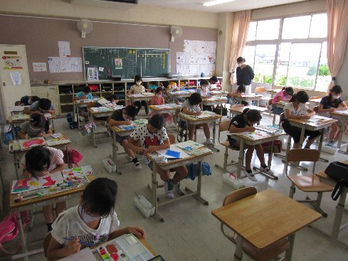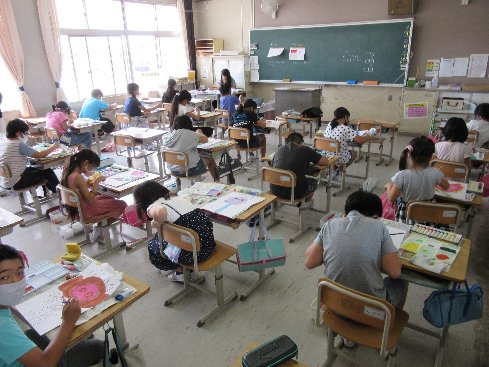 3・4時間目は図画工作の授業でした。「まぼろしの花」の仕上げで色塗りをしました。