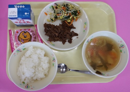 ご飯、牛乳、ビビンバ(肉炒め、ナムル)、中華スープ、苺のミニ鯛焼き