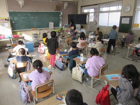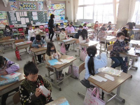 1時間目は図画工作の授業でした。「はこでつくったよ」の箱を組み立てて、くっつけて、いろんな形を作りました。