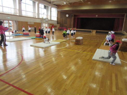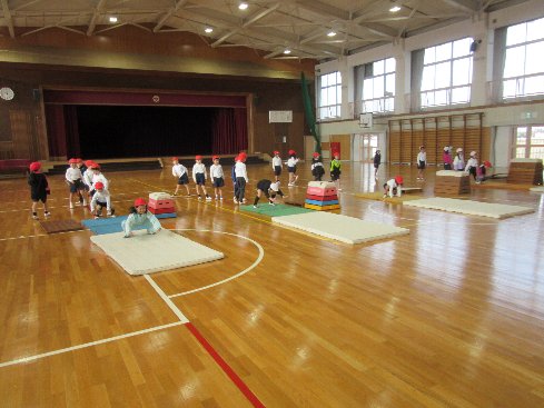 2時間目は体育の授業でした。開脚跳びが上手にできるように、マットの上で体さばきの練習をしました。