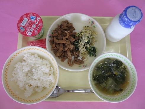 ご飯、牛乳、ビビンバ(肉炒め、ナムル)チンゲンサイの中華スープ、ヨーグルト