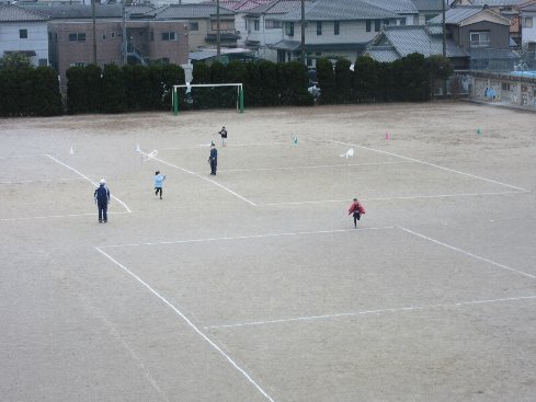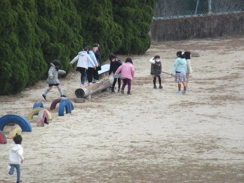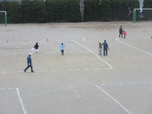 1・2時間目に、昔遊びの会で行えなかった凧あげを行いました。風がなく、穏やかな天気でしたが、凧あげにはちょっぴり不向きでした。班ごとに交代して、運動場の真ん中で走ってあげました。