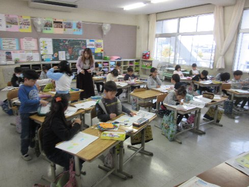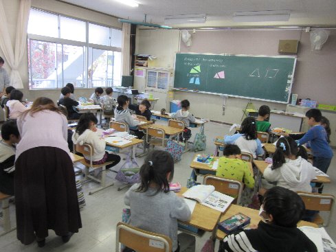1時間目は算数の授業でした。「三角形と四角形」で色紙を切って、いろいろな三角形や四角形を作りました。