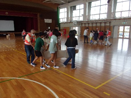1時間目は防災教室でした。あま市防災ネットの皆さんに、毛布を使った担架で運ぶ方法を教えていただきました。