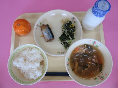 ご飯、牛乳、さばの塩焼き、小松菜のおひたし、具だくさん汁、スイートポテト